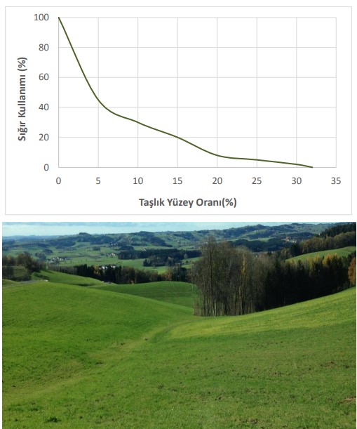 Sığırlar, aşağıdaki grafikte de görüldüğü üzere taş oranı fazla olan meralarda otlamak istemez. Çayır-mera yüzeyinin % 5’i taşlık iken sürüdeki sığırların % 60’ı, meradan kaçınırken taşlık alan oranı % 20’ye çıktığında sığırların % 90’ı meradan kaçınmaktadır. Taşlık alan oranının % 30’un üstüne çıktığı mera alanlarında ise sürünün tamamı merada otlamaktan kaçınmaktadır. Bu nedenle, çayır-mera alanlarından, sadece ot (yem bitkileri) üretiminin artırılması için değil, sığırların taşlık alandaki davranışları da dikkate alınarak taşlar toplanmalıdır.
